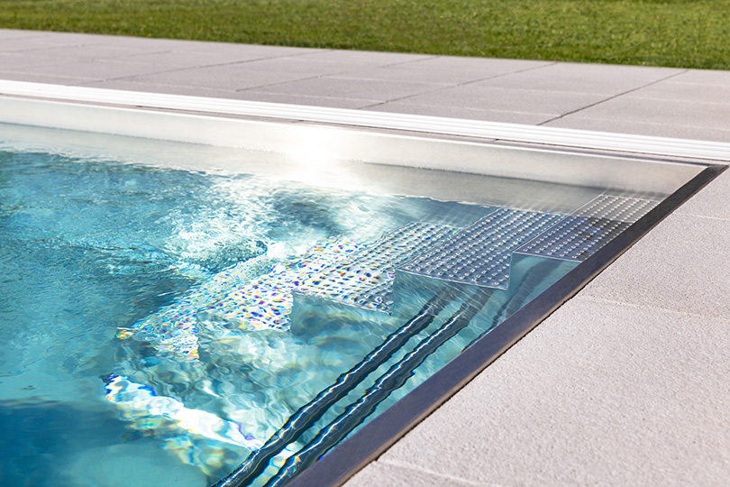 Für Perfektionisten: Für eine plane Pool Umgebung können Sie die Schienen auch bündig in die Umrandung einlassen oder sich für ein Modell mit einseitiger Schiene oder schienenlos entscheiden.