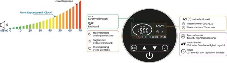 Der technische Hintergrund: eine herkömmliche Pool-Umwälzpumpe ohne Drehzahlregelung läuft permanent unter Vollast und verbraucht sehr viel Energie. Die volle Leistung wird jedoch nur für den Rückspülvorgang benötigt. Unsere iClock® EnergySaver Poolsteuerung reduziert stufenlos und individuell die Drehzahl Ihrer Pool-Umwälzpumpe, welche dadurch drehzahlgeregelt wird. Mit niedrigerer Drehzahl wird zwar die Umwälzdauer etwas verlängert, der Energieverbrauch ist bei einer drehzahlgesteuerten Poolpumpe aufgrund der niedrigeren Drehzahl jedoch nur noch ein Bruchteil. Ähnlich wie bei einem Auto: wenn dieses permanent unter Vollgas läuft, verbraucht es sehr viel Energie. Reduziert man die Drehzahl des Motors, benötigt man zwar etwas länger bis man am Ziel ist, reduziert aber den Verbrauch für die gleiche Strecke auf einen Bruchteil. Die Dauer spielt bei einer Umwälzung im Pool keine Rolle.