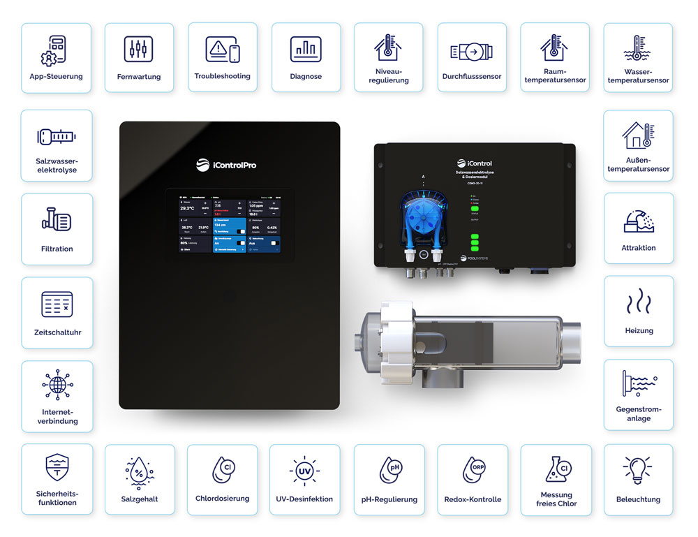 | Poolsteuerung | iControlPro Touch Salt mit Touchscreen- sowie App-/Websteuerung, automatischer Salzwasserelektrolyse & pH-Regulierung |