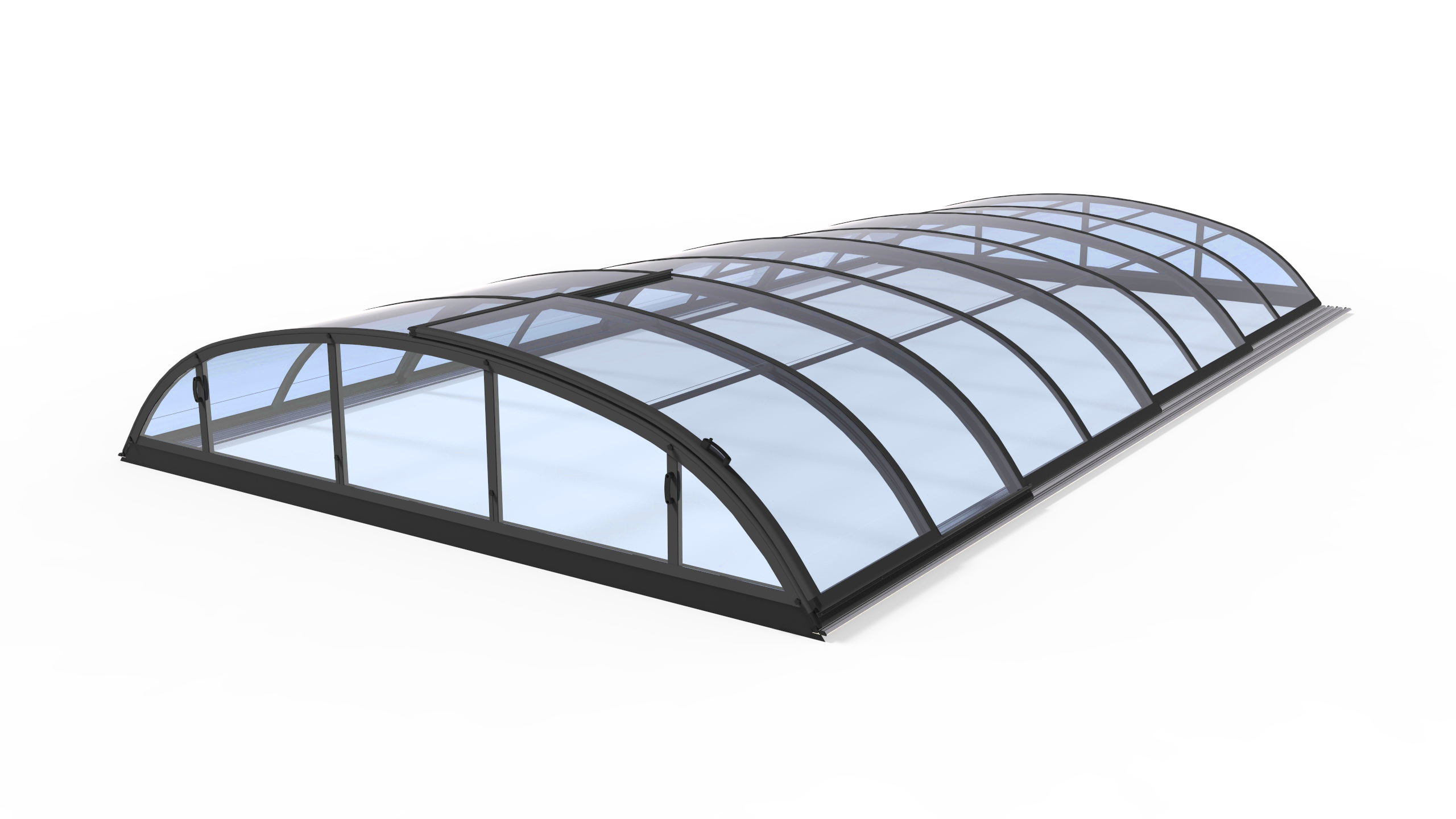 Ihnen gefällt die Form der Poolüberdachung „Base“, aber Sie möchten diese allerdings etwas niedriger? Dann ist die Schwimmbadüberdachung „Solid“ genau die richtige für Sie. Eine niedrige halbrunde Form, ein Seiteneingang und begehbare Air-Schienen.