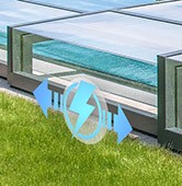 Mit unserem nahezu schienenlosen System gewährleisten wir die maximale Ästhetik Ihrer Pool-Landschaft. Genießen Sie eine unberührte Poolumrandung ohne Schmutzfänger, Wasseransammlungen oder Stolperfallen. Unsere Überdachungen benötigen lediglich eine sehr kurze Führungsschiene für das kleinste Modul, welche sich ohnehin auf der gegenüberliegenden Seite des Einstiegs befindet und daher zu keinerlei Einschränkung in Komfort und Optik führt.