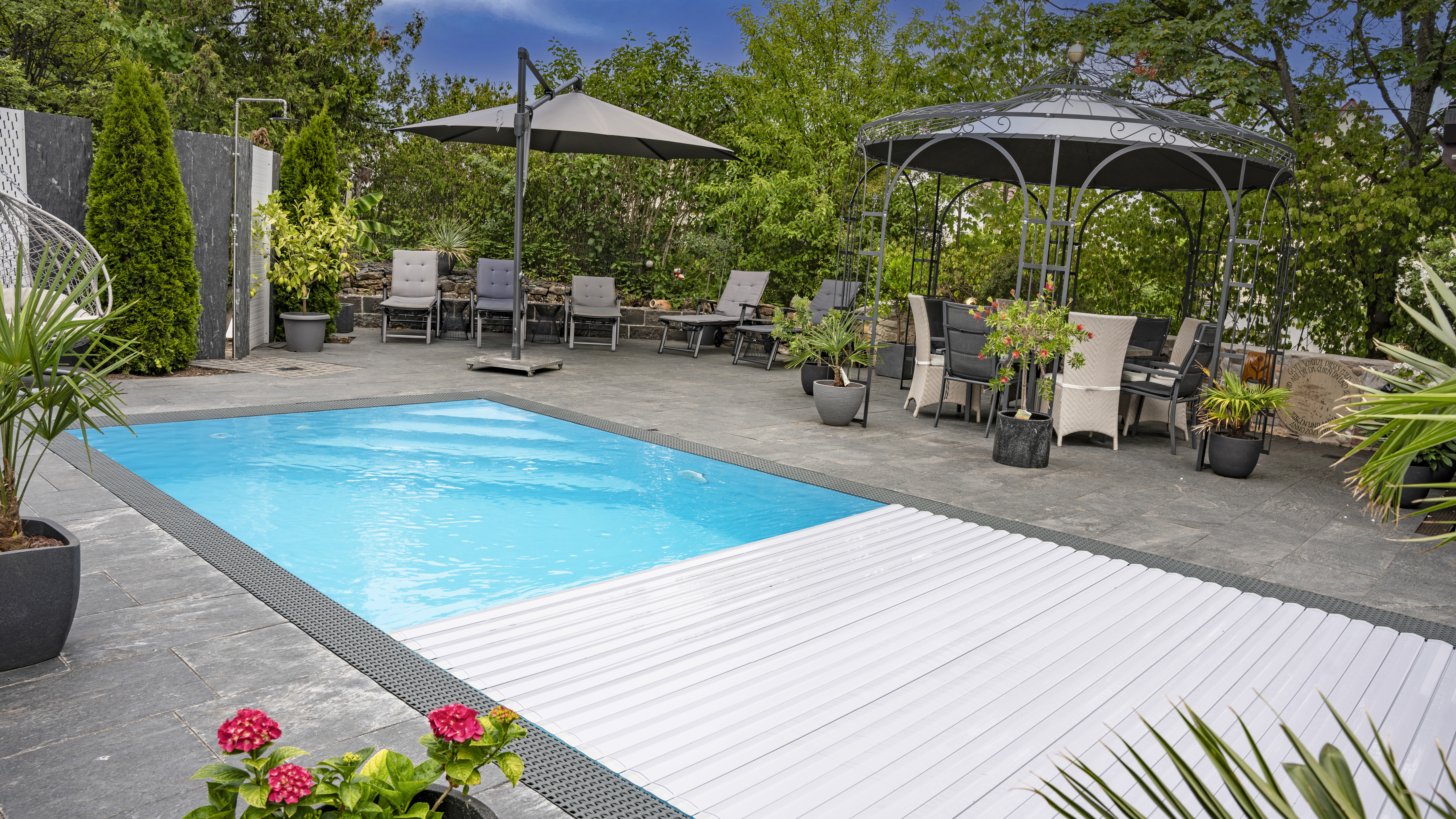 Nicht jede Abdeckung passt zu jedem Pool. Je klarer und symmetrischer die Beckenform, desto einfacher ist die Umsetzung: