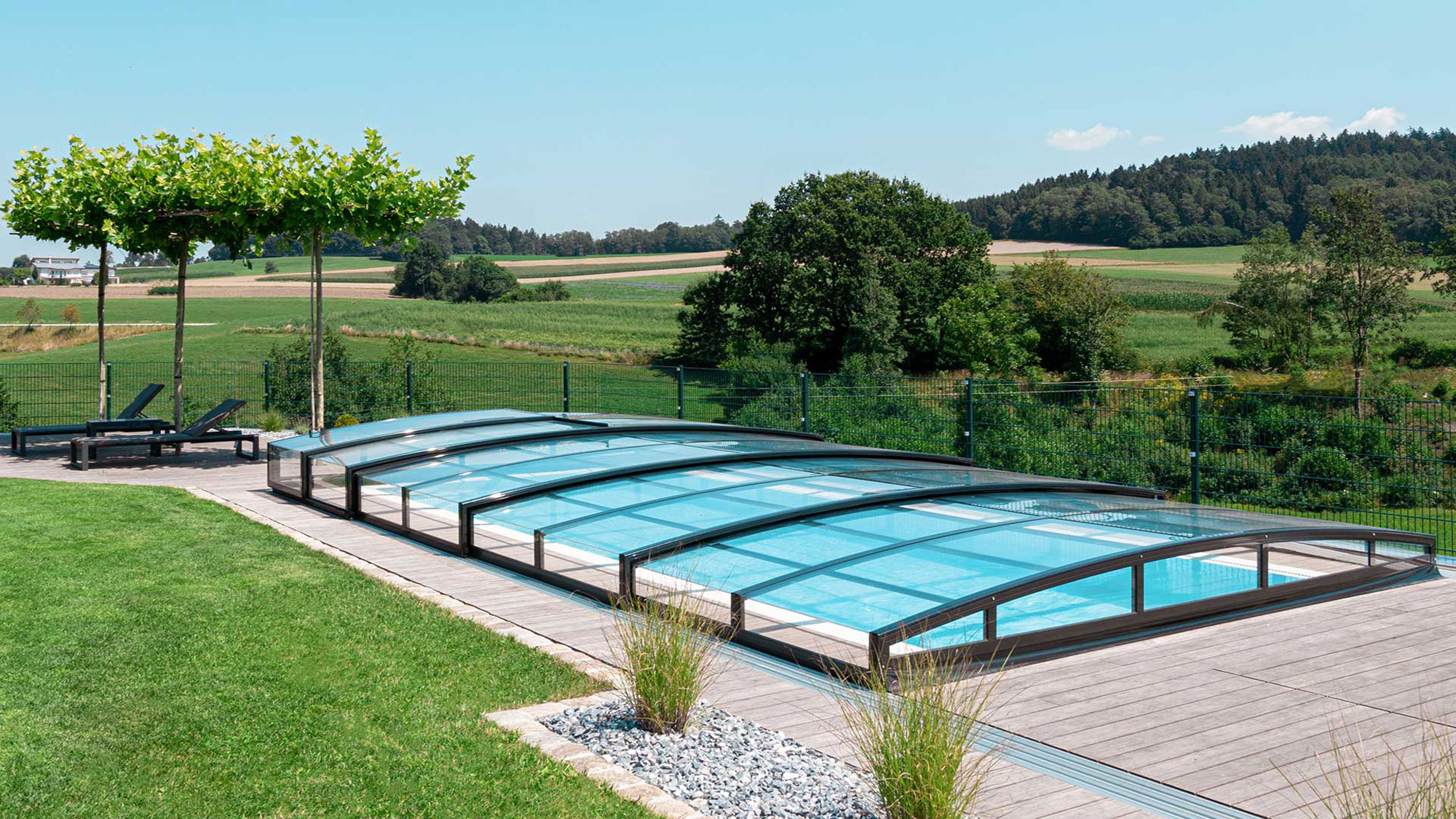 Flache Poolüberdachungen sind besonders dezent und fügen sich nahezu unsichtbar in moderne Gartenkonzepte ein.